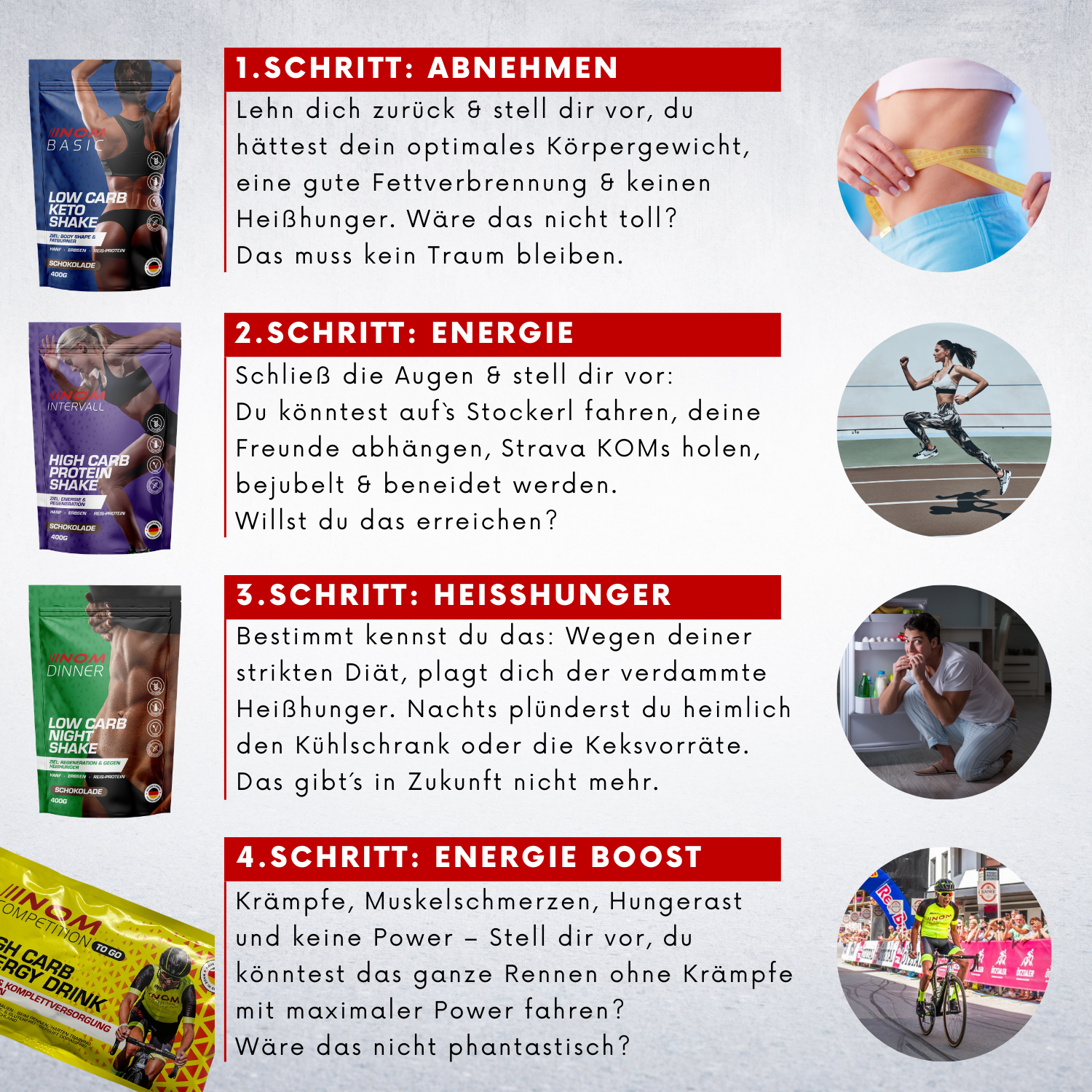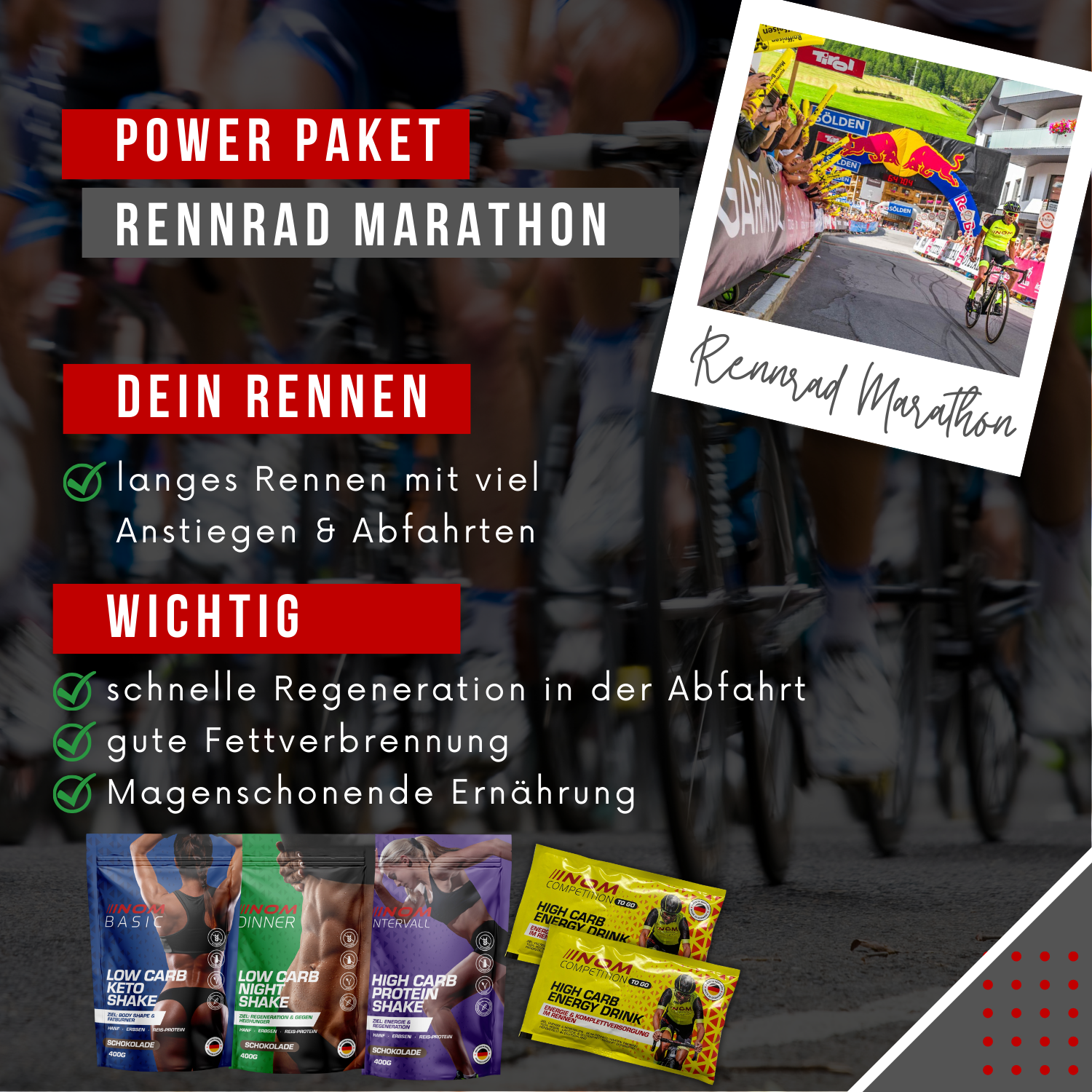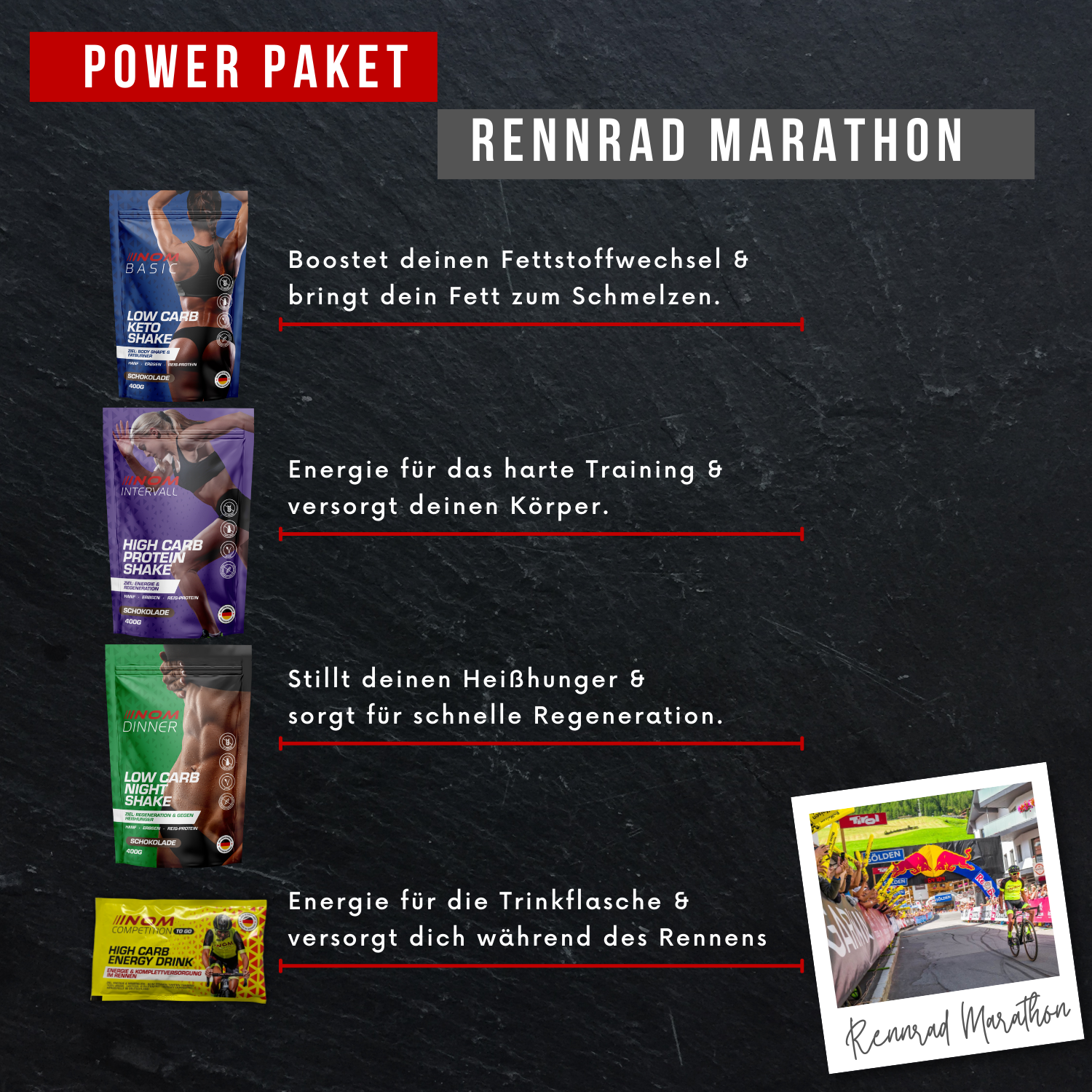 Ihr Körper ist bis zum Anschlag belastet. Dann ist es wichtig, Ihren Magen zu schonen und den Körper trotzdem mit allem Notwendigen zu versorgen. Oftmals bleibt keine Zeit, um Nahrung aufzunehmen, denn jede Sekunde zählt. Deswegen ist Flüssignahrung die einzige logische Lösung. Ideale Regenerationszeit und gestaffelte Energiefreigabe unterstützen Ihren Körper während dem Rennen.