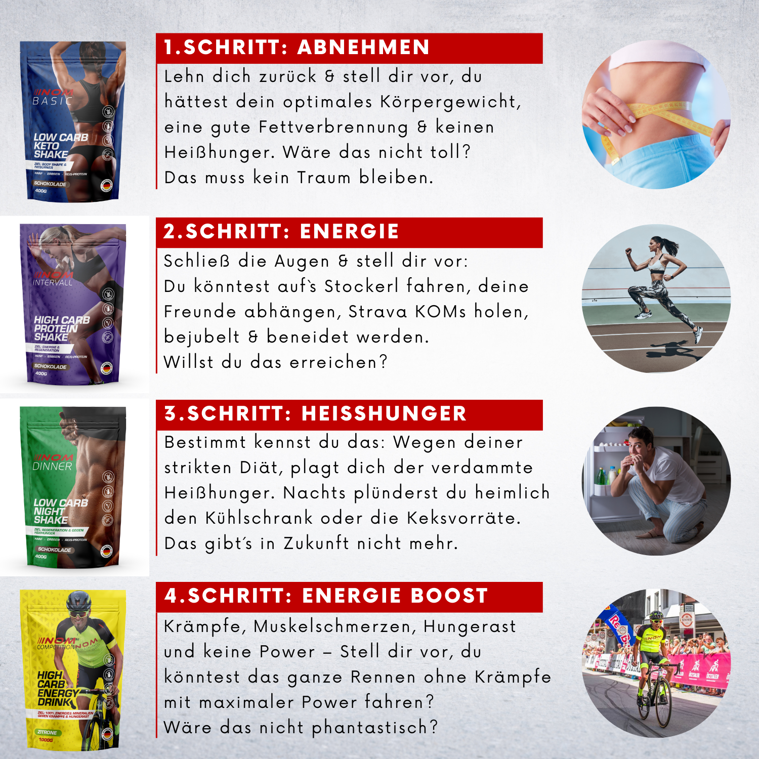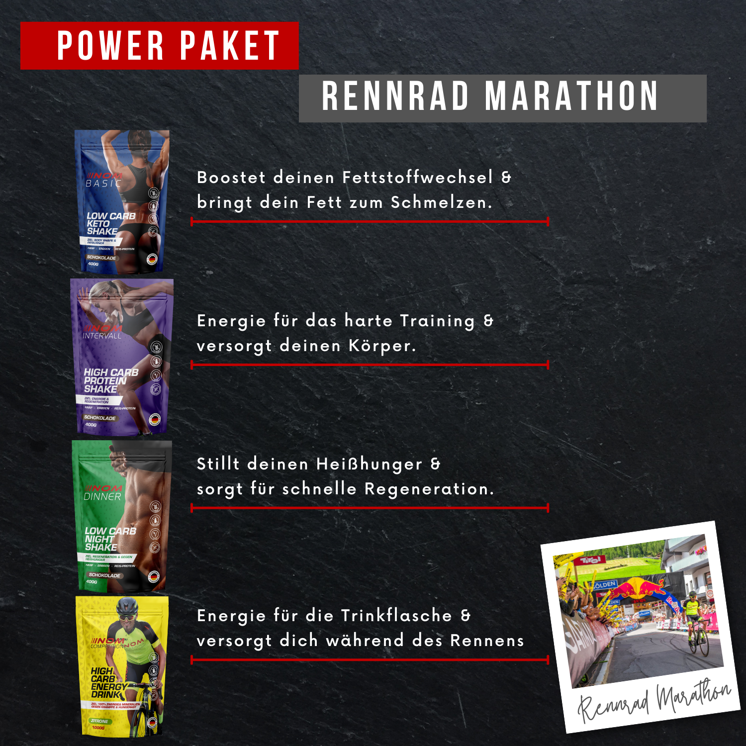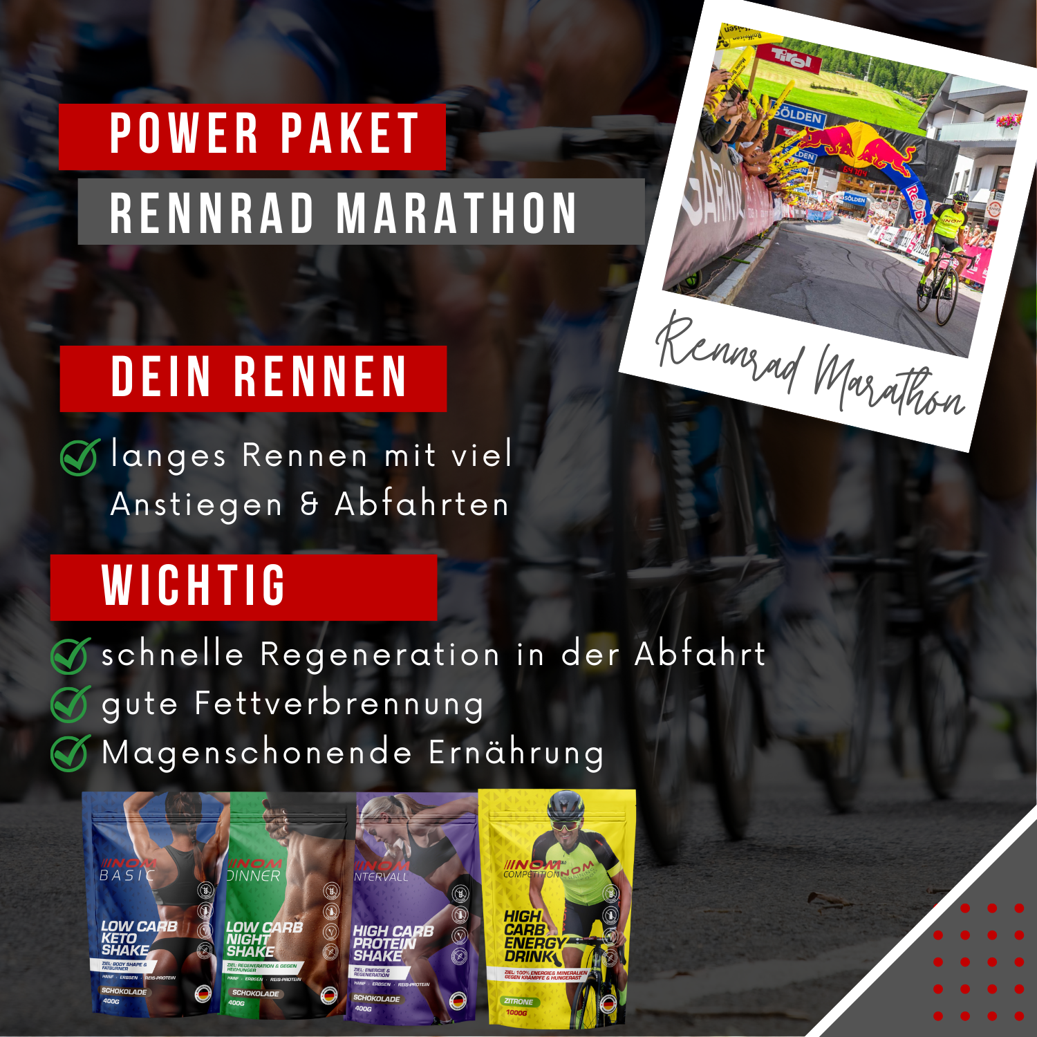 Ihr Körper ist bis zum Anschlag belastet. Dann ist es wichtig, Ihren Magen zu schonen und den Körper trotzdem mit allem Notwendigen zu versorgen. Oftmals bleibt keine Zeit, um Nahrung aufzunehmen, denn jede Sekunde zählt. Deswegen ist Flüssignahrung die einzige logische Lösung. Ideale Regenerationszeit und gestaffelte Energiefreigabe unterstützen Ihren Körper während dem Rennen.